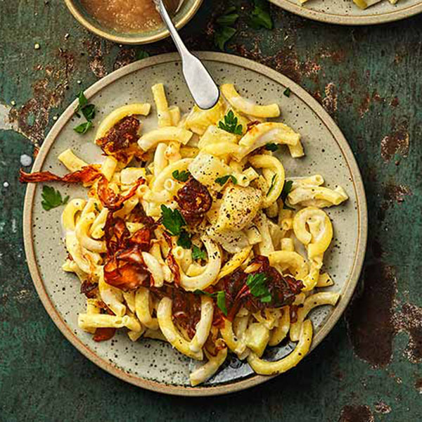 Peler les pommes de terre et les couper en dés d’env. 2 cm. Porter le bouillon et la crème de soja à ébullition dans une casserole. Ajouter les pommes de terre et les pâtes, cuire env. 10 min à couvert sur feu doux jusqu’à ce que les pâtes soient al dente et que le liquide soit entièrement absorbé.